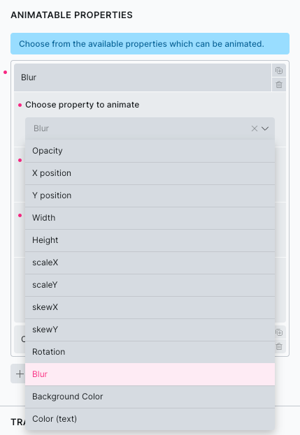 Currently, you can animate the opacity, X and/or Y positions, width/height, scale the object along the X and/or Y axis, blur, skew the object along the X and/or Y axis, rotate the object change the background color, and change text color.